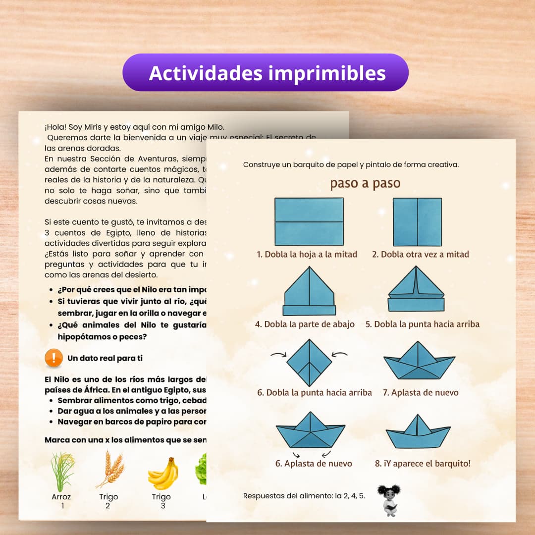 📝 Actividades imprimibles: mapa del Nilo, dibujo creativo y preguntas para reflexionar.